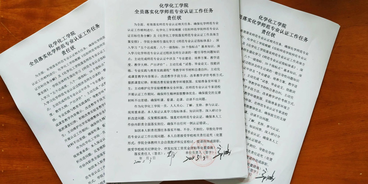 结合“能力作风建设”“制度体系建设”相关活动安排,公司专门举行《全员落实师范专业认证工作任务责任状》签订仪式,进一步提高全院教师对化学师范专业认证工作的重视程度,增强了全体教师的责任感、使命感。为进一步推动有序落实化学师范专业认证工作各项任务强化了制度约束力和目标执行力,为实现化学师范专业认证工作圆满顺利通过认证奠定了坚实基础。(太阳成tyc122cc集团 教学办供稿 王红军 冷向宇审稿 郭鹏审核)