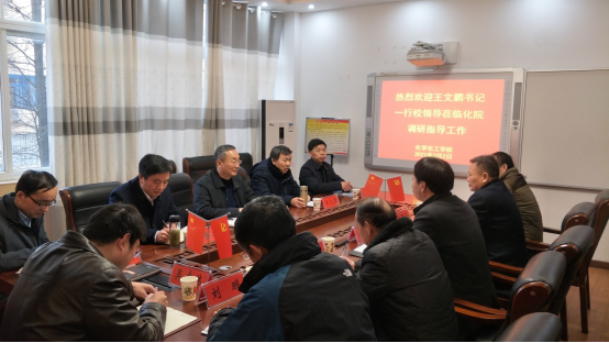 2021年2月2日下午,农历牛年新春佳节即将到来之际,公司党委书记王文鹏一行校领导莅临太阳成tyc122cc集团视察指导工作。公司党委副书记、工会主席王文臣,副董事长余本海、党办主任林兴岚等有关领导陪同调研。化学化工公司党委书记郭鹏、经理井强山等党政班子成员全程陪同视察并参加座谈。