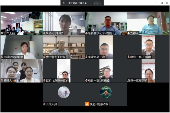本次硕士研究生学位论文答辩会分3个小组进行,第一组包含学科教学(化学)专业硕士研究生7人,第二组包含无机化学、物理化学及有机化学方向硕士研究生8人,第三组为分析化学方向硕士研究生6人。第一组邀请了息县一高中学正高级教师赵明主任担任答辩主席,华中师范大学王世存副教授,刘德汞、郭鹏、王玲玲、王红军、朱建君等校内外导师担任答辩委员。第二组邀请了河南大学牛景杨教授担任答辩主席,井强山、刘鹏、樊阳、曹新华、饶伟浩、唐林、姜勇等校内导师担任答辩委员;第三组邀请了郑州大学屈凌波教授担任答辩主席,黄淮公司刘彦明教授,曹俊涛、甘甜、许婧、何梦媛等校内外导师担任答辩委员。
