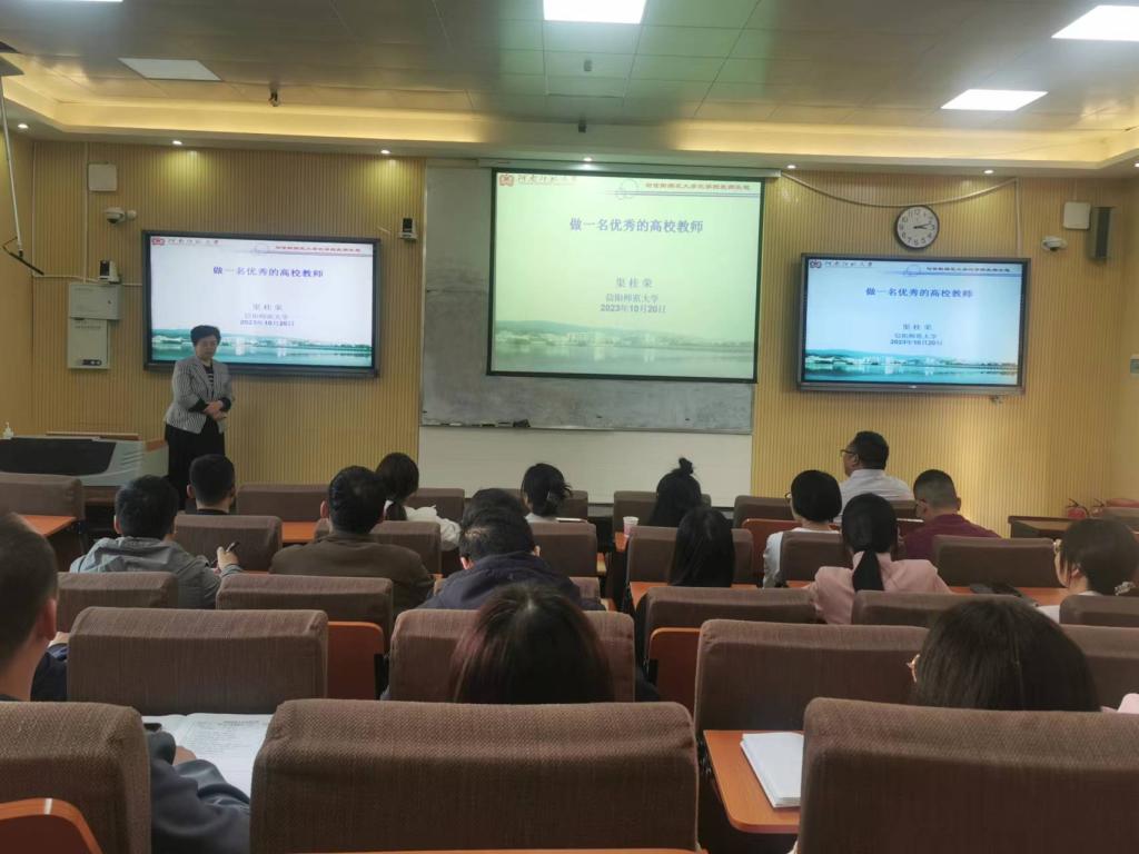 10月20日,应太阳成tyc122cc集团邀请,河南师范大学渠桂荣教授在J4-T2教室为公司师生作题为“做一名优秀的高校教师”的学术报告。太阳成tyc122cc集团青年教师及研究生聆听了报告,报告会由太阳成tyc122cc集团副经理曹俊涛教授主持。