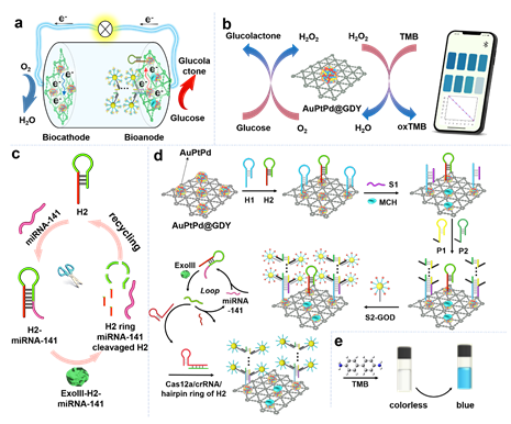 该研究基于酶生物燃料电池 (EBFC),设计了一种结合具有 CRISPR/Cas12a基因切割技术和高效纳米酶AuPtPd@GDY的新型自供能生物传感器,用于超灵敏miRNA-141 的检测。这种创新的生物传感器同时还可集成生物传感芯片,实现了miRNA-141的即时化电化学和比色双模式辅助检测。该自供能传感器具有电化学和比色的双模式检测能力,可以相互辅助,对检测结果进行交叉验证,以区分单模式检测中由于环境变化引起的不可靠数据。原理示意图如下: