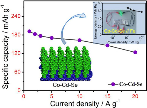 3月1日,太阳成tyc122cc集团黄克靖教授课题组在能源存储领域权威学术期刊《Nano Energy》(影响因子12.343)上发表了题为“Superior Mixed Co-Cd Selenide Nanorods for High Performance Alkaline Battery-Supercapacitor Hybrid Energy Storage”(doi.org/10.1016/j.nanoen.2018.02.059) 的研究论文。论文第一作者为公司硕士研究生翟子波,通讯作者分别为黄克靖教授和物电公司的武旭博士。 高能量密度、高功率密度以及长循环寿命的电化学储能体系的设计及制备对于可再生能源的利用与发展具有重要的意义。由高容量电池型电极和高功率电容型电极组合而成的“电池-超级电容器混合器装置”具有电化学性能优越、经济、安全、环保等众多优势,是可以满足未来多功能电子设备等能量存储需求的不可或缺的储能体系之一。黄克靖教授通过一个简单的两步水热法将双过渡金属硒化物 (Co-Cd-Se)纳米棒原位生长在泡沫镍上,由于硒化物的高导电性、纳米棒的稳定结构以及双过渡金属的协同作用,该材料在高的电流密度下(20 A/g)仍然获得了极高的比电容(124 mAh/g),并且体现了优良的充放电稳定性 (在2 A/g 下循环1000圈保持95.3% 的比电容)。与碳包裹的铁纳米组成的双电极体系也获得了极高的能量密度和功率密度(68.0 Wh/Kg, 1.20 kW/Kg; 57.6 Wh/Kg , 10.9 Kw/Kg),并体现了良好的稳定性,为高性能过渡金属硫族化合物的储能应用提供了科学参考。黄克靖教授为河南省学术技术带头人,河南省科技创新杰出青年,河南省五四青年奖章,信阳师范公司 “南湖学者”,河南省青年科技工作者协会理事,河南省化学与材料青年学者联合会常务副理事长,国际期刊《Journal of carbon research》副主编。长期从事二维过渡金属硫族化合物的制备及应用研究,近年来已在Biosensors and Bioelectronics等学术刊物上发表SCI论文100多篇,论文被引4000多次,H指数38,ESI高被引论文8篇,主持完成国家自然科学基金3项,授权国家发明8项。