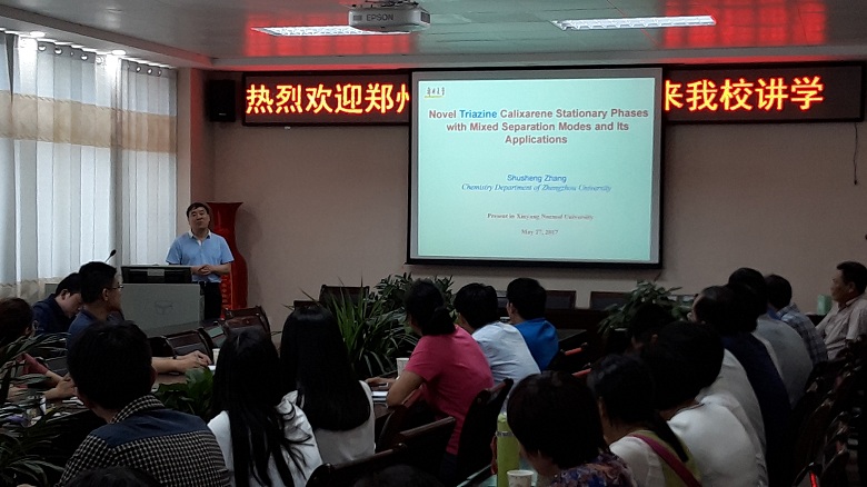 5月27日,应公司邀请,郑州大学现代分析与计算中心主任张书胜教授在化学楼学术报告厅作了题为“三嗪杯芳烃色谱固定相研究及其分析应用”和“郑州大学现代分析与计算中心创新运行机制”的学术报告,全体青年教师和研究生参加了报告会,报告会由太阳成tyc122cc集团经理井强山教授主持。