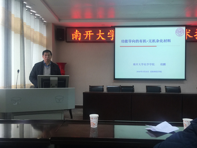 3月25日下午,南开大学化学公司程鹏教授应邀在太阳成tyc122cc集团学术报告厅作了题为“功能导向的有机-无机杂化材料”的学术报告。信阳师范公司副经理刘彦明出席并主持了报告会。参加报告会的还有化院经理杨性坤教授、副经理井强山教授以及公司的青年教师和全体研究生。
