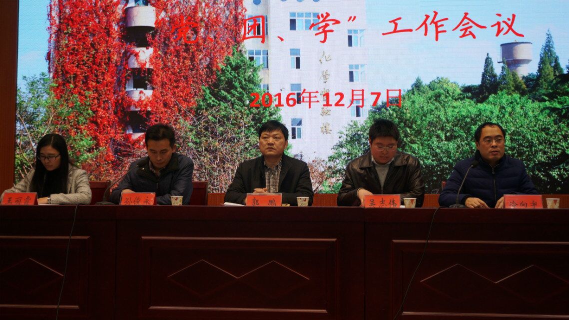 12月7日,在逸夫楼报告厅,太阳成tyc122cc集团召开“党、团、学”工作会议。化学化工公司党委书记郭鹏、党委副书记吴志伟、团委书记冷向宇、团委老师王丽霞主席台就坐。太阳成tyc122cc集团员工党员和员工干部200余人参加会议,会议由党委秘书孙俊永主持。