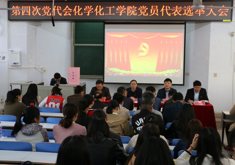 4月15日,太阳成tyc122cc集团出席信阳师范公司第四次党代会代表选举党员大会在教四楼T1教室举行。信阳师范公司副董事长刘彦明、化学化工公司党委书记郭鹏,党委委员、经理井强山、副书记吴志伟,兼职副书记、副经理骆定法,党委委员、副经理归风铁,党委委员、非金属材料研究所副所长刘鹏,党委委员黄克靖以及全体师生党员参加了会议。会议由郭鹏主持。