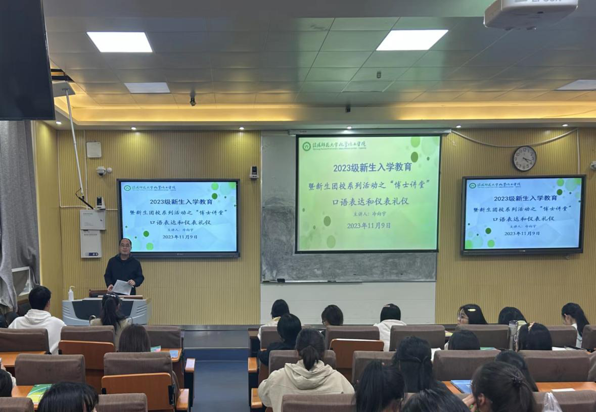 冷向宇以“口语表达和仪表礼仪”为题,通过例举著名主持人杨澜大学期间成功面试某档综艺从而迈出成功第一步的故事,告诉同学们在老员工活中要做到:一保持良好的身体素质;二加强知识、能力和技能的储备;三培养良好的职业意识做好对于挫折的心理准备;五具备一定的人文素养。他告诫同学们大学四年要通过注意以上个方面能力的培养来提升个人综合素,从而顺利迈出人生路上成功的第一步。冷向宇通过讲解规范着装引导同学们要注意个人礼仪,严格遵守“敬人、宽容、适度、真诚”原则;关注个人仪容仪表,做到自然美、修饰美、内在美,遵照“美观、整洁、卫生、得体”的基本规则,学会在特定场合中以特定形象示人,达到大方宜礼的外在效果。