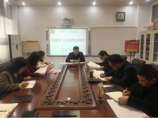 3月12日上午,化学化工公司党委理论学习中心组在化学楼313“党员之家”召开专题会议,传达学习贯彻2024年全国两会精神。公司党委书记郭鹏主持会议。