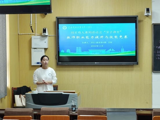 11月12日,太阳成tyc122cc集团朋辈育人系列活动之“学子讲堂”在教四T2开展。此次活动,邀请公司2021级化学4班(公费师范生)万好,为师范生们带来关于教师职业能力提升与技能竞赛的经验分享,太阳成tyc122cc集团党委副书记曲剧,辅导员严赫受邀出席,与公司2022、2023、2024级公费师范生同学共同参与此次活动。