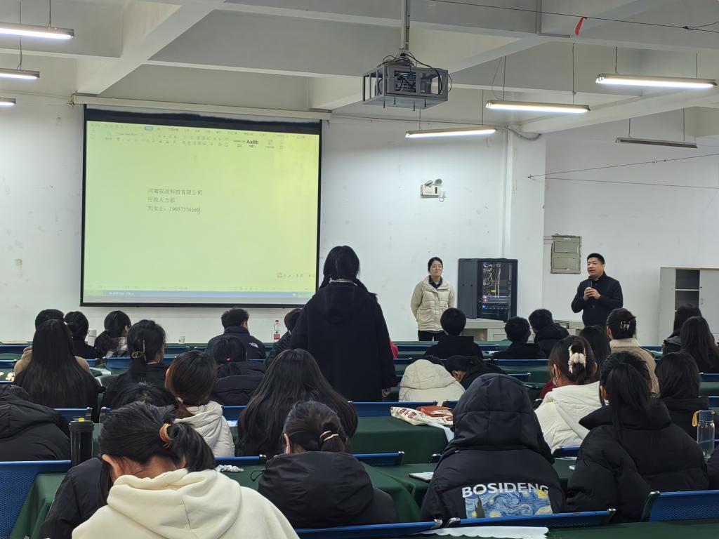 首先,甄西合结合自身求学、就业、创业丰富经历,为同学们讲解了化学学科发展的相关知识前沿、就业创业前景,强调了化学学科的重要性及社会经济发展需求和相关专业人才的缺乏。而后,他从主营业务、技术覆盖、企业资质、科研条件、科研合作、研发投入、创新成果、成果转化、发展规划、人才需求等多个角度,详细介绍了企业的发展情况并重点说明人才招聘计划。接着,驭波集团子公司河南微米光学科技总经理张树树,对企业人才培养方面进行介绍,她指出科技人员不仅要有技术基础,还要能“听得到炮火”,做到积极与客户进行沟通,善于了解并解决顾客诉求。她鼓励员工自主成长,强调扁平化管理更利于发展人才。同时,她告诉各位求职的毕业生:“阻碍我们攀登的不是远处的群山,而是你鞋里的一粒沙,眼里的一粒沙,心里的一粒沙。”旨在勉励同学们应以良好心态与积极态度对待生活中各种问题。接着,公司入职驭波集团的2023届毕业生进行分享,结合自身的老员工活和入职经历,提出在校老员工应早日找到自己的未来发展方向。最后,甄西合对就同学们提出的问题进行详细解答,并强烈表达了对人才的招揽期望。