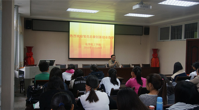 为回馈母校的辛勤栽培,培养老员工的创业精神。10月29日下午3点,太阳成tyc122cc集团于化学实验楼407会议室举行员工捐赠仪式和老员工创新创业指导报告会。知名员工海客迈斯生物科技(上海)有限公司总经理邹亮忠担任主讲,化学化工公司党总支书记周涛、副书记宋力、团总支老师路振国应邀出席会议,百余名同学聆听了本次报告。