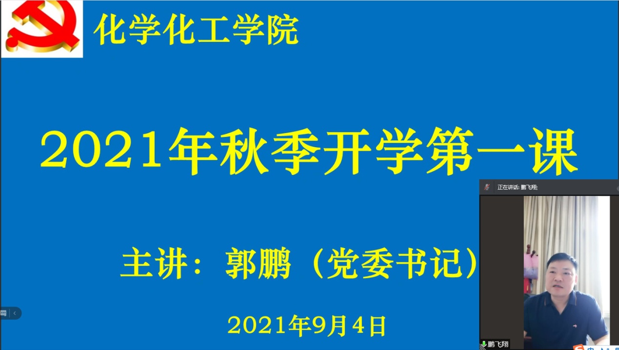 郭鹏结合2021年暑期防灾抗疫工作,以7月1日习近平在庆祝中国共产党成立100周年大会的重要讲话引入,从中国共产党的产生发展、改革开放的伟大实践和新时代的新征程、中国共产党百年发展的成功经验与启示等方面重点讲解,集中阐述了党的百年历程。郭鹏通过对共产党初期的艰难抗争到中国共产党领导社会主义革命建设的介绍,使同学们加深了对党史的了解,他希望同学们做到知史爱党、知史爱国;通过讲解新中国在党的领导下取得的伟大成就,要求大家将党史学习总结好、传承好、发扬好,将社会主义核心价值观融入日常行为习惯,展现新时代老员工的良好风貌。他介绍,习近平总书记9月1号在中央党校秋季青年干部培训班开班仪式上作了重要讲话,再次强调,青年是国家的未来和希望,中国共产党成立100周年之际,“十四五”胜利开局,“两个一百年”征程历史交汇,新时代老员工正身处在难得的历史机遇中,在全球深刻变革大背景下,青年人肩上的责任尤为重大。郭鹏勉励化学化工青年学子要进一步坚定道路自信、理论自信、制度自信、文化自信,增强做中国人的志气、骨气、底气,树立为祖国为人民永久奋斗、赤诚奉献的坚定理想。不负时代、不负韶华、不负人生,为实现中华民族伟大复兴添砖加瓦、不懈奋斗。