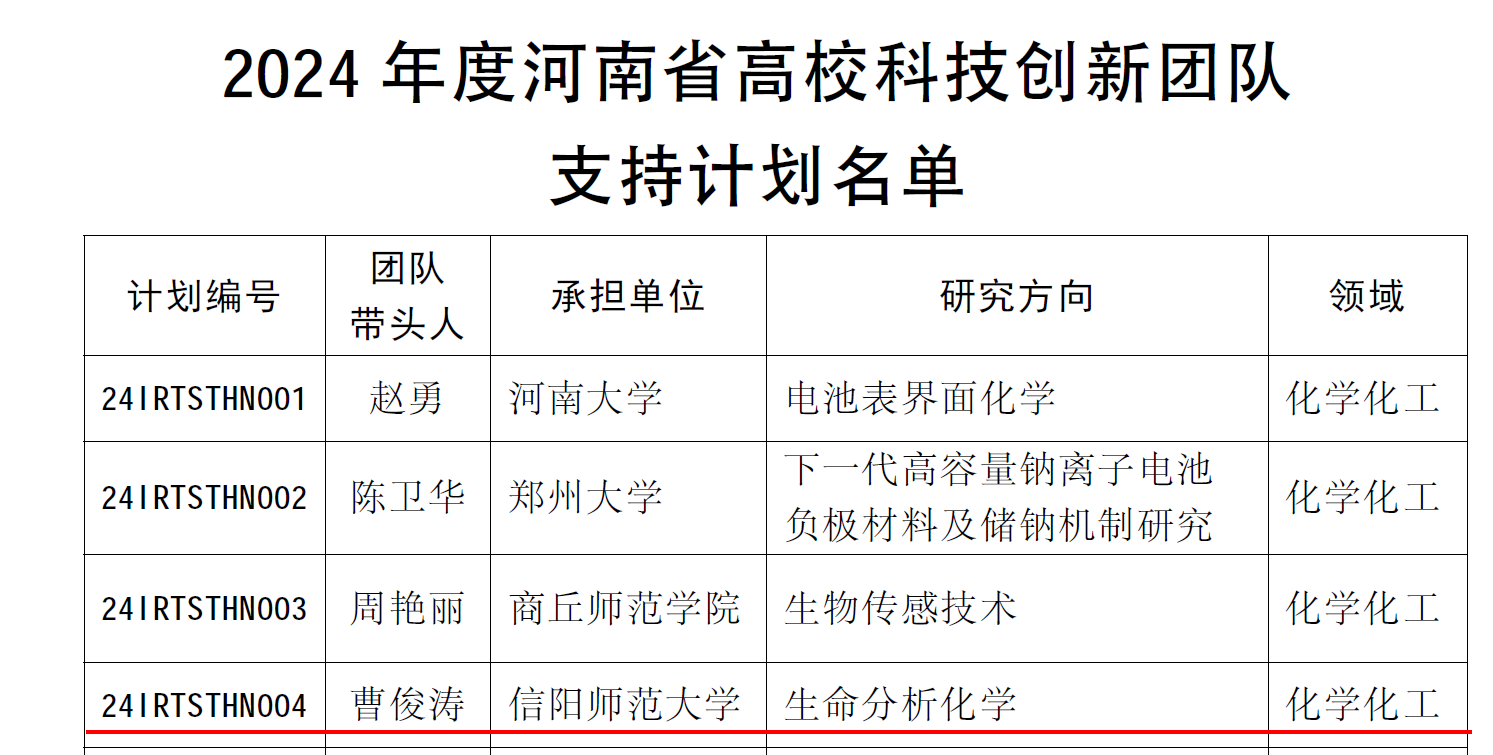 近日,河南省教育厅公布了2024年度河南省高校科技创新团队和创新人才立项名单(教科技〔2023〕325号文件),公司曹俊涛教授牵头申报的“功能纳米材料生物分析”研究团队获得河南省高校科技创新团队项目支持,资助金额为50万元。