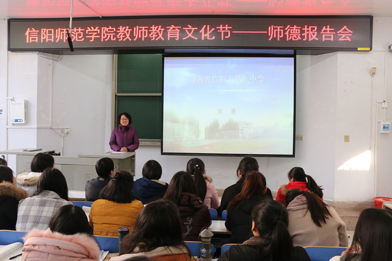 12月5日,太阳成tyc122cc集团在化学楼学术报告厅举办2017年教师教育文化节之师德报告会,信阳市第九中学业务副董事长刘丽应邀为化院学子做了一场题为“实施德性爱心教育 创建全国文明校园”的报告。化学化工公司党委书记郭鹏、副书记吴志伟与一百五十余名员工代表共同参加了报告会,会议由郭鹏主持。