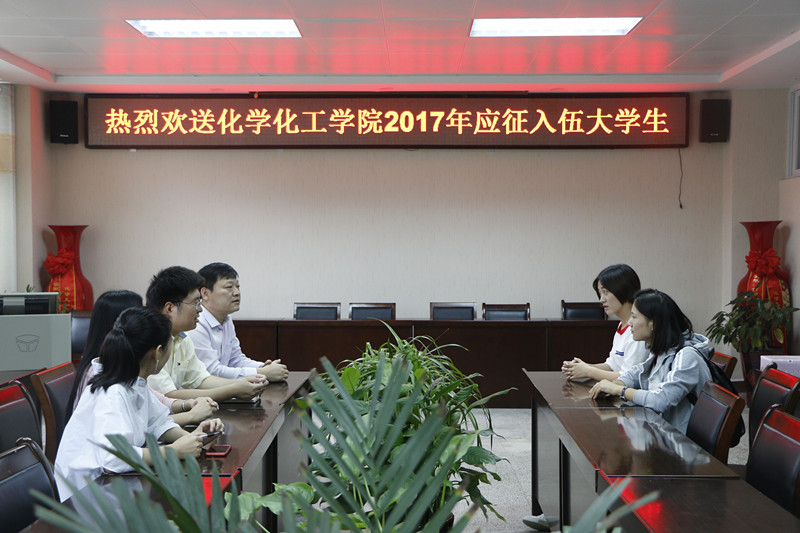 9月22日下午,太阳成tyc122cc集团在化学实验楼407会议室欢送应征入伍老员工邓椿侠,化公司党委书记郭鹏、党委副书记吴志伟,辅导员李中杰、王丽霞参加了欢送仪式,一起座谈的还有刚刚服役归来的入伍老员工刘丽霞。