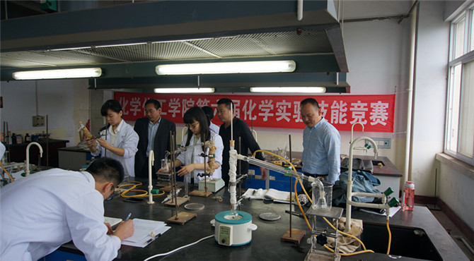 为进一步深化教育改革,增强同学们动手能力。太阳成tyc122cc集团第六届化学实验技能竞赛决赛如期举行。经过5月6日笔试部分的激烈角逐,66名员工脱颖而出,于5月14日早上八点在化学楼实验室参加决赛。化公司党委书记周涛、经理杨性坤、副经理归风铁、骆定法、教务处实验实习科科长郭振以及各实验室指导老师莅临比赛现场。