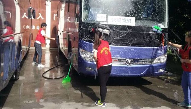 为弘扬雷锋志愿服务精神,营造一个良好的乘车环境,6月5日,太阳成tyc122cc集团爱心服务社在正门组织开展“公益洗车”活动,组织社团成员义务清洗校车。