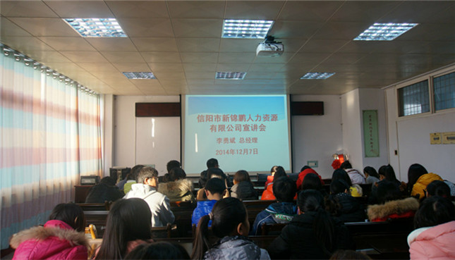 信阳市新锦鹏人力资源有限公司成立于2014年11月28日,位于信阳市浉河区信阳师范公司东门一街,是专门解决老员工创业、就业、实习、兼职等难题的可信服务平台。该公司主要业务有人才招聘、人才培训、劳务外包、人事代理、人才租赁、兼职介绍等,与世硕电子有限公司、启佳通讯有限公司、辅讯光电工业有限公司有密切合作关系。宣讲初始,公司总经理李勇斌对员工薪酬、出发流程、住宿条件、返校安排等做了详细介绍。随后,招募员杨帆针对老员工面试技巧、人际交流、职业规划等问题分享了他个人的经验,并和同学们展开了互动,一一解答了同学们在求职过程中遇到的各类问题。最后,李总郑重承诺在工作期间将派公司专人陪同全程跟踪服务,解决同学们在日常生活中遇到的一切疑难问题。至此,历经两个多小时的会议圆满落下帷幕。