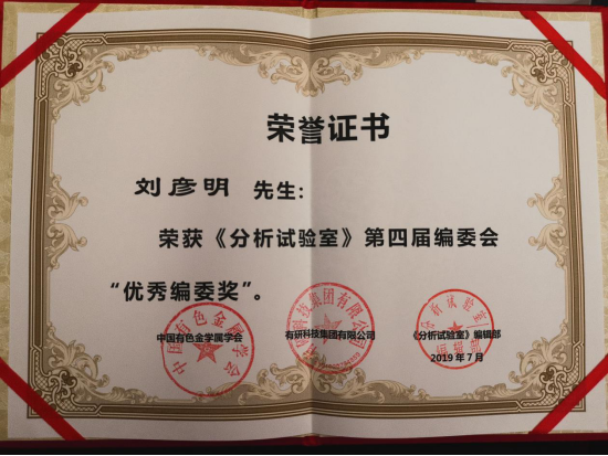 刘彦明教授获《分析试验室》优秀编委奖