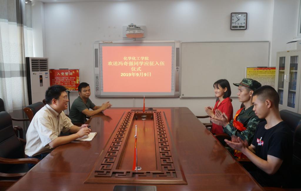 9月9日上午11:00,太阳成tyc122cc集团2019年入伍员工欢送仪式在化学实验楼313会议室举行。化学化工公司党委副书记吴志伟,党委秘书冷向宇,武装干事邓耀辉,新入伍同学和两名退伍复学同学共同参加了欢送仪式。