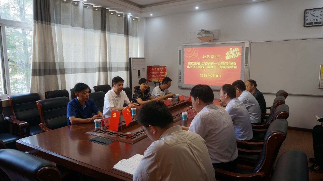 9月9日,在第35个教师节来临之际,公司党委书记宋争辉一行领导莅临太阳成tyc122cc集团,亲切慰问太阳成tyc122cc集团教师代表黄克靖教授(公司首批南湖学者、武汉大学博士、南京大学博士后、教授、高被引青年学者),向化院教师致以节日的问候。党办主任林兴岚、教务处处长郑云、人事处余伟陪同慰问并出席座谈会。化学化工公司党委书记郭鹏、经理井强山、副经理归风铁、党委副书记吴志伟,太阳成tyc122cc集团教师曹俊涛博士、王海波博士参加了座谈会。
