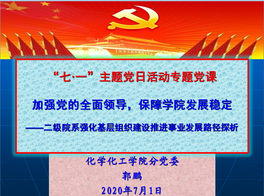 7月1日下午,公司党委书记郭鹏为师生党员讲授了《加强党的全面领导,保障公司发展稳定》的七·一专题党课。党课报告上,郭鹏围绕坚持中国共产党全面领导,结合“坚持党对一切工作的领导是中国共产党的必然选择”“坚持和完善党领导一切工作的制度”“不断提高党对一切工作的领导能力”“二级公司强化党的领导保障事业发展路径”等几方面,从历史与现实、国内与国外、理论与实践、基层的体会等几个维度进行了深入浅出地讲解。他表示,在中国共产党的领导下,党员同志要更清楚地把握“百年未有之变革”进程中中国抗疫的大国担当、东西两种意识形态的持久对抗、以儒家文化为代表的东方治理模式、世界多极发展等方面的“变”化要素,厘清全球化大势、亚太区域发展重要性、中国和平崛起、新工业革命浪潮等方面的“不变”趋势。这次抗疫斗争充分彰显了新时代以习近平同志为核心的党中央驾驭复杂面的高超水平和担当,充分彰显了社会主义制度的巨大优越性,他要求,全体党员教师要更加坚定对马克思主义、中国共产党领导、中国特色社会主义道路的政治认同、理论认同、情感认同,将“小我”积极融入“大我”之中,以高校知识分子的家国情怀,以党员的初心使命积极投身中国特色社会主义伟大实践,为奋力实现“两个一百年”的奋斗目标和中华民族伟大复兴的中国梦而贡献智慧和力量。