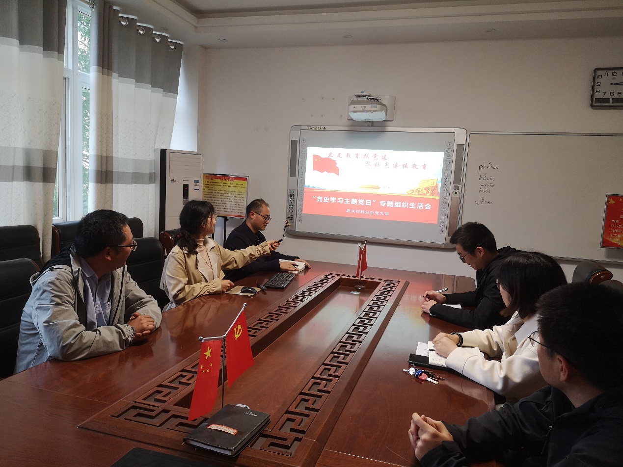 4月20日下午,纳米材料分析化学党支部在实验楼“党员之家”举办了党史学习教育交流活动,党支部书记许婧主持学习交流活动。