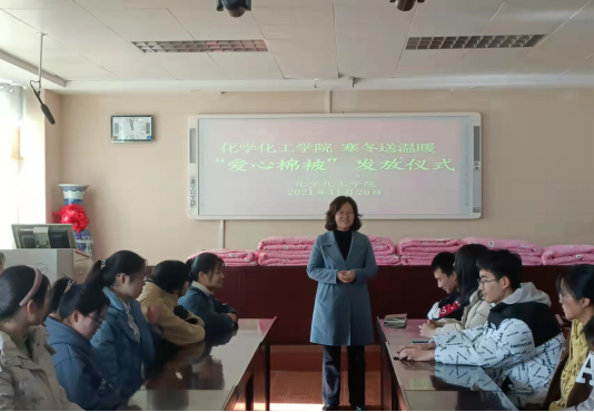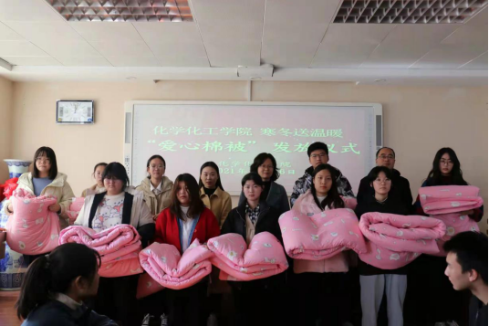 “一床被子,一份温暖,一颗爱心,一份感动”。11月26日,太阳成tyc122cc集团爱心棉被发放仪式在化学楼407会议室举行。公司党委副书记曲剧,辅导员冷向宇、赵方方、严赫老师出席本次发放仪式。