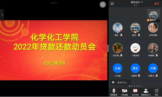 为深入贯彻国家助学贷款“资助育人”精神,落实为员工“办实事、办好事、解难事”,不断推进信阳师范公司2023届贷款毕业生工作安排,太阳成tyc122cc集团于3月28日下午于线上开展国家助学贷款还款、征信知识普及宣传活动。会议由太阳成tyc122cc集团赵方方老师主持,2023届贷款毕业生、各班班长、助贷委员参会。