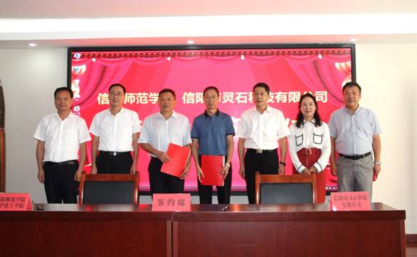 李正军、刘彦明及信阳市科技局等共同见证了重点实验室主任井强山与信阳市灵石科技有限公司董事长肖学党签订合作协议,并为设立在该公司的公司的实习实训基地揭牌,随后,参会人员共同参观了公司的生产车间、产品展示厅和现场施工演示。