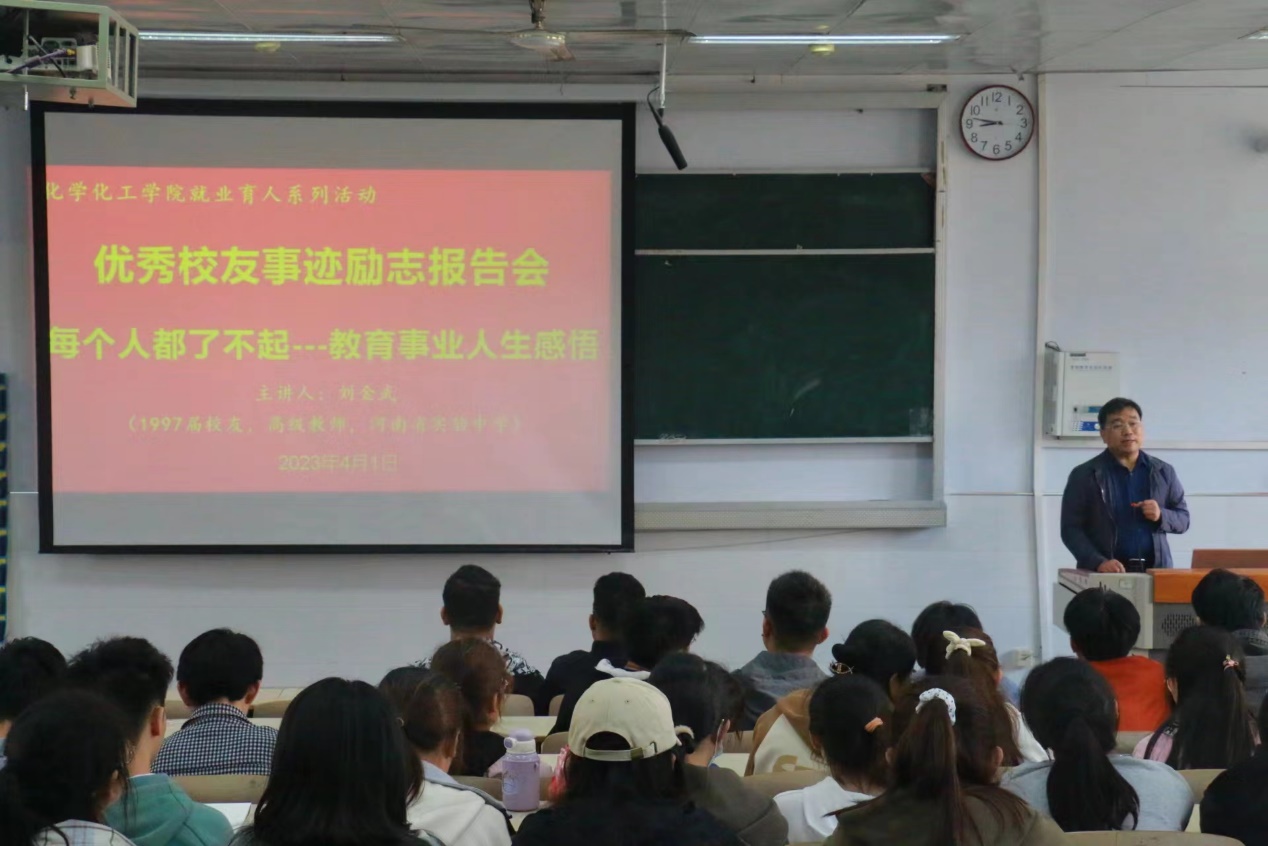 4月1日,太阳成tyc122cc集团在教6-101多媒体教室举办“每个人都了不起---教育事业人生感悟”优秀员工事迹励志报告会。报告会邀请到太阳成tyc122cc集团1997届优秀员工、河南省实验中学高级教师刘金武。报告会由化学化工公司党委书记郭鹏主持。2022级公费师范生、化学专业员工代表到会聆听并互动交流。